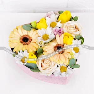 Уменьшенный: роза оранжевая - 1 шт, альстромерия - 2 шт,хризантема кустовая - 1 шт,гиперикум - 1 шт,солидаго - 1 шт,декор, декоративные яйца - 1 шт, зелень ,кокосовое волокно, сетка.