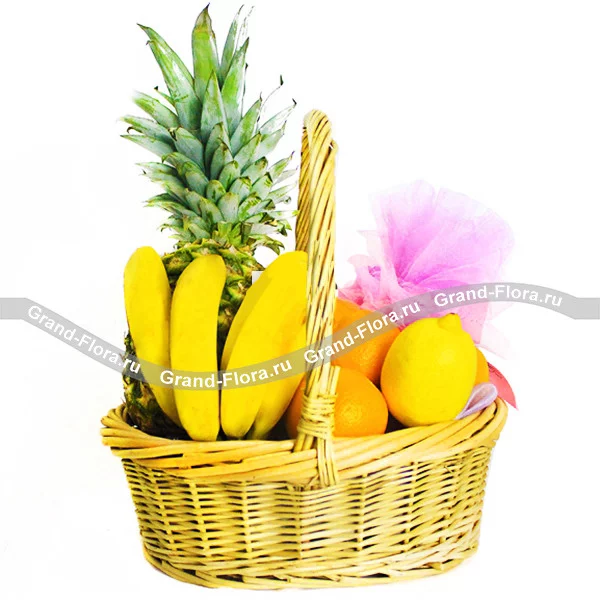 Стандартный: бананы - 1,5 кг, ананас - 1 шт., апельсины - 2кг, лимон - 2 шт., бант, декор, корзина средняя.