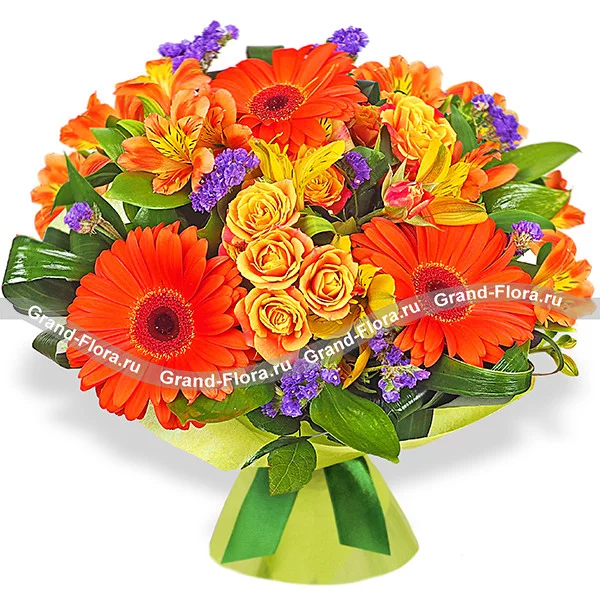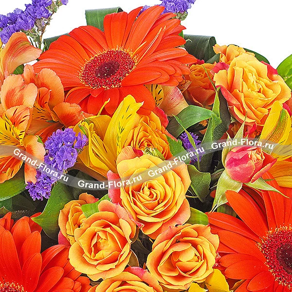 Композиция составлена из ярких оранжевых альстромерий, гербер и роз с непринужденным добавлением фиолетовой статицы.