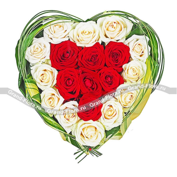 Думаете как при помощи цветов можно удивить девушку? Мы Вам поможем! Прекрасно подойдет данная композиця из белых и красных роз в форме сердца -  олицетворяющая самое прекрасное чувство на свете - любовь.
