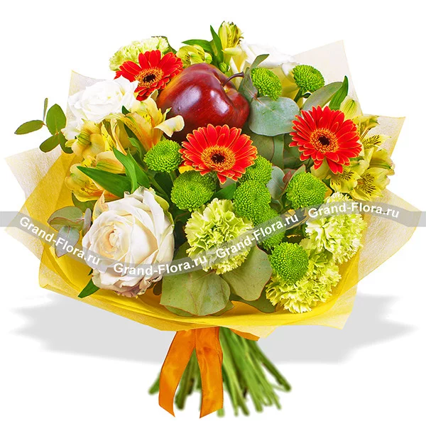 Стандартный: роза белая - 5 шт., гербера оранжевая - 2 шт., хризантема зеленая кустовая (сантини) - 2 шт., гвоздика зеленая - 2 шт., альстромерия желтая - 2 шт., эвкалипт - 2 шт., фетр желтый, бант оранжевый, яблоко декоративное.