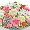 Стандартный: роза белая - 3 шт., хризантема кустовая - 2 шт., гвоздика розовая - 3 шт., гвоздика кустовая розовая - 1 шт., зелень, упаковка лента.
