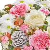 Уменьшенный: роза белая - 2 шт., хризантема кустовая - 2 шт., гвоздика розовая - 2 шт., гвоздика кустовая розовая - 1 шт., зелень, упаковка лента.