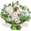 Стандартный: хризантема кустовая белая - 5 шт., эвкалипт - 2 шт., рускус - 2 шт., ель, шишки - 2 шт., упаковка крафт, лента.