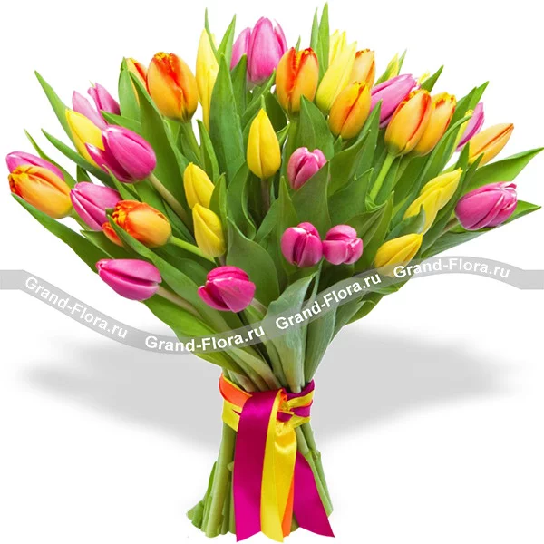 Тюльпан – это нежный и хрупкий цветок, который способен покорить своей красотой даже самое неприступное и ледяное сердце. А огромный букет желтых тюльпанов может стать для вас началом примирения с любимой девушкой или зажжет страсть в глазах сотрудницы, которая вам давно симпатична.rnНе стоит думать, что желтые тюльпаны являются предвестниками чего-то плохого, ведь эти солнечные бутоны могут поднять настроение и внести позитив в серые холодные будни. Но только при условии, что вы закажите букет из тюльпанов с доставкой уже сегодня.rnЗаказывая цветы в службе доставки цветов Grand-flora, вы можете быть уверены, что ваш любимый человек получит самые свежие и ароматные бутоны.