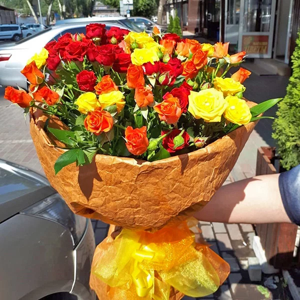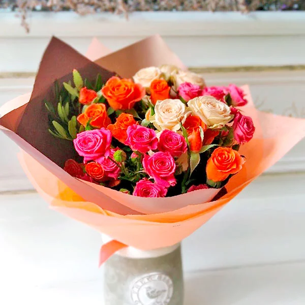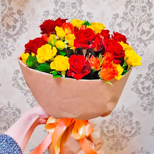 ДЕЛЮКС (на фото): роза кустовая оранжевая - 8 шт., роза кустовая красная - 8 шт., роза кустовая желтая - 9 шт., упаковка, лента. Примерный размер: 45Х45 см.