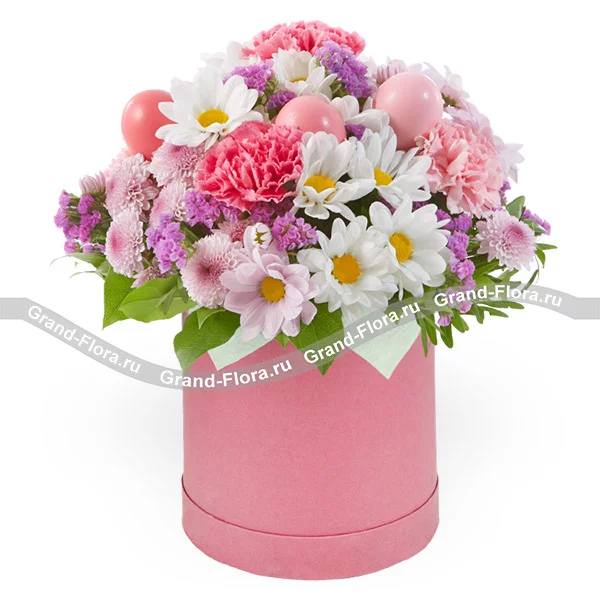 Стандартный: гвоздика розовая - 3 шт., хризантема кустовая белая - 3 шт., хризантема кустовая розовая - 1 шт., статица, декоративная зелень, пасхальный декор, оазис, коробка.