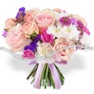 роза розовая - 2 шт., роза кустовая розовая - 1 шт., хризантема кустовая белая - 1 шт., гвоздика белая - 1 шт., тюльпан розовый - 3 шт.(замена на розу или альстромерию), хризантема кустовая фиолетовая - 1 шт., статица, лимониум, лента. Примерный размер: 20Х20 см.